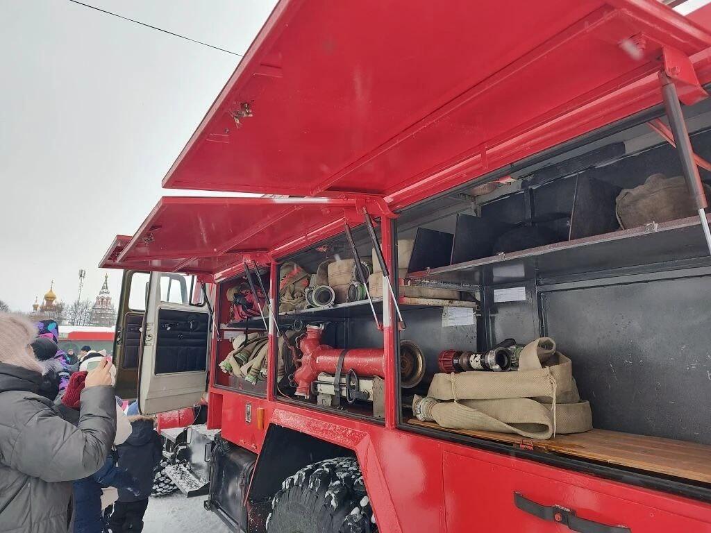 Дети с большим интересом изучали пожарный автотранспорт и оборудование. Все желающие получили возможность примерить боевую одежду огнеборцев, посидеть в кабине пожарной машины и сделать фотографии на память.